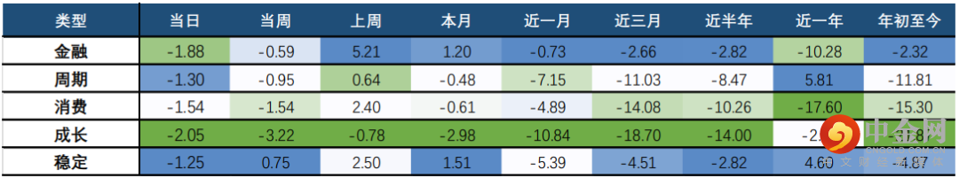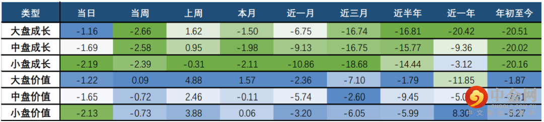 巨潮风格方面,近期表现较优的价值风格未有明显优势;其中,大盘价值、大盘成长跌幅较小,分别下跌1.16%、1.22%;但大盘整体表现强于小盘,其中小盘价值、小盘成长跌幅均超2%。