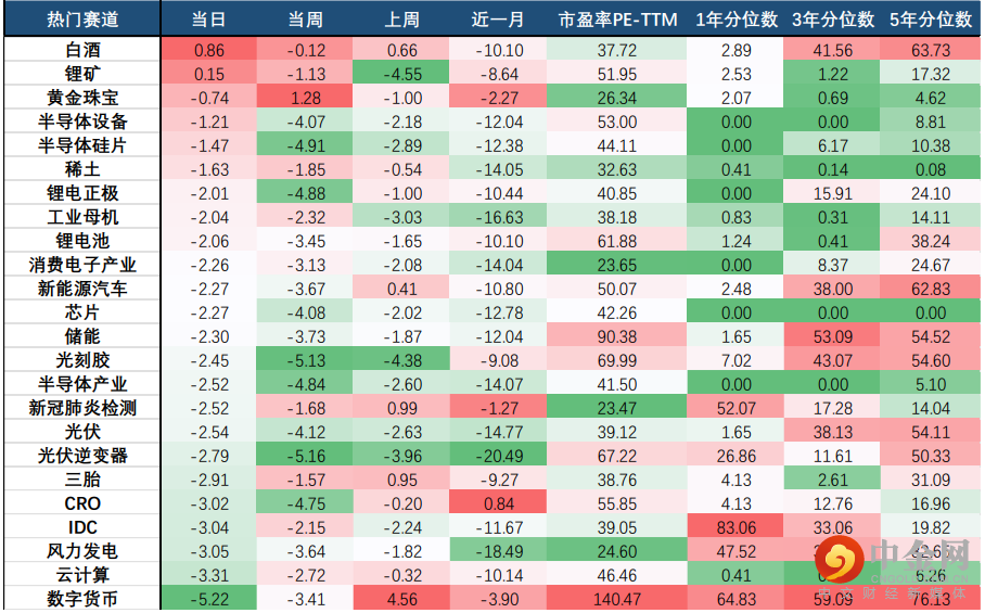 热门赛道方面,除白酒、锂矿收涨外,其他各赛道均出现下跌;近日表现较优的数字货币则大幅下跌,当日跌幅超5%;半导体赛道则继续着下跌趋势,其中半导体设备、半导体硅片跌幅超1%,而光刻胶、半导体产业则跌幅超2%;新能源相关赛道则仍旧低迷,除锂矿当日上涨0.15外,多数赛道跌幅均超2%。