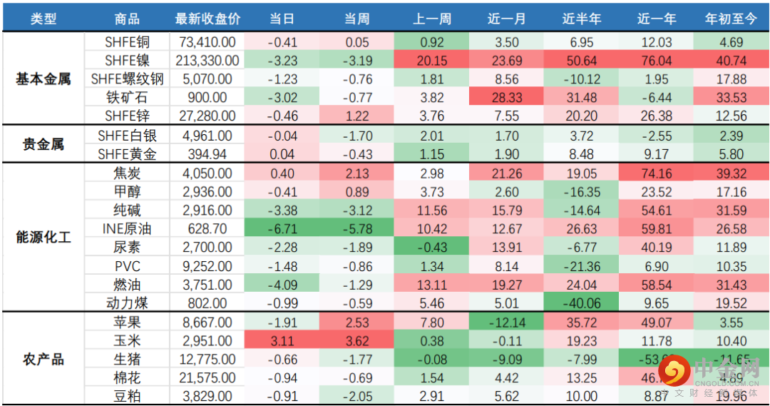 国内商品期市收盘多数下跌,能化品领跌,原油跌逾6%,低硫燃料油、燃油跌逾4%;基本金属全线下跌,沪铝、沪镍跌逾3%;黑色系多数下跌,铁矿石跌逾3%,锰硅、线材跌逾2%;农产品涨跌不一,棕榈油、粳稻涨逾1%,红枣跌逾4%,苹果跌近2%,玉米价格走强,当日上涨3.11%;贵金属涨跌不一。