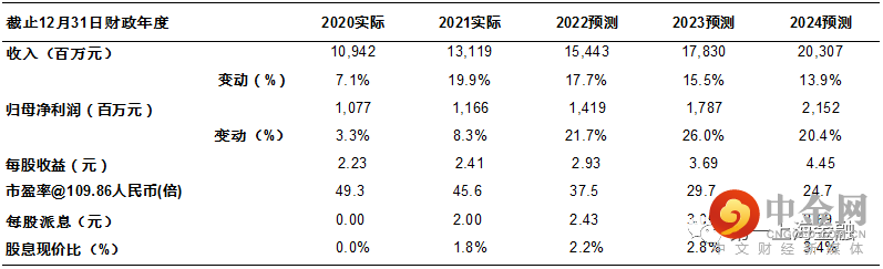 综上所述,我们认为疫情反复对行业干扰为短期影响,未来随着国内旅游业及餐饮行业逐步复苏,公司通过继续以“国际高端品牌+本地强势品牌”的品牌组合为依托,有望助推全渠道的强劲扩张,实现未来市场份额及利润的稳步提高,预计2022-2024年净利润有望实现14.2/17.9/21.5亿元,给予目标价146.6元,相当于22财年盈利预测的50倍PE,距离当前股价有+33.4%涨幅,维持买入评级。
