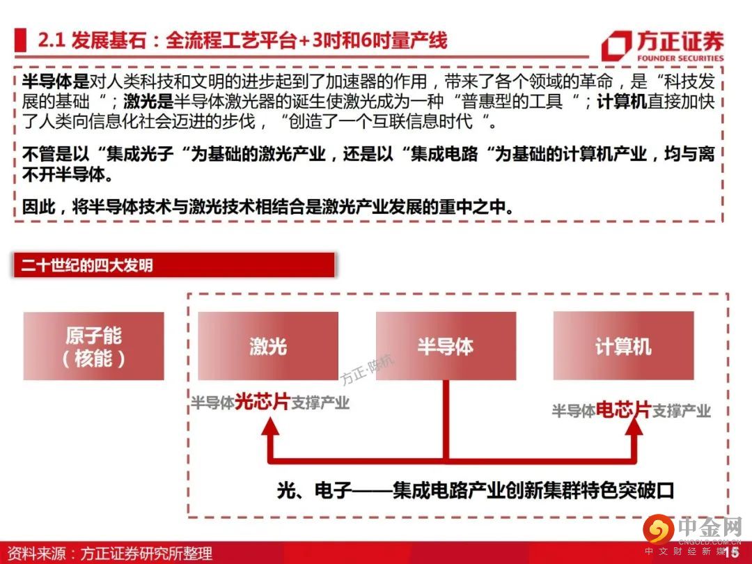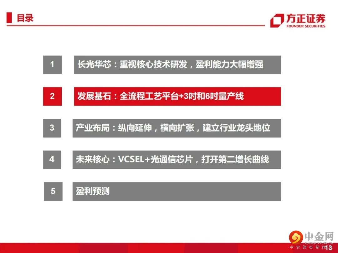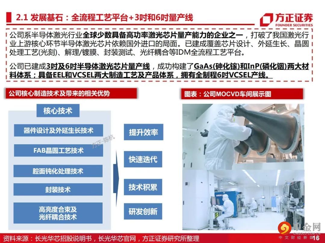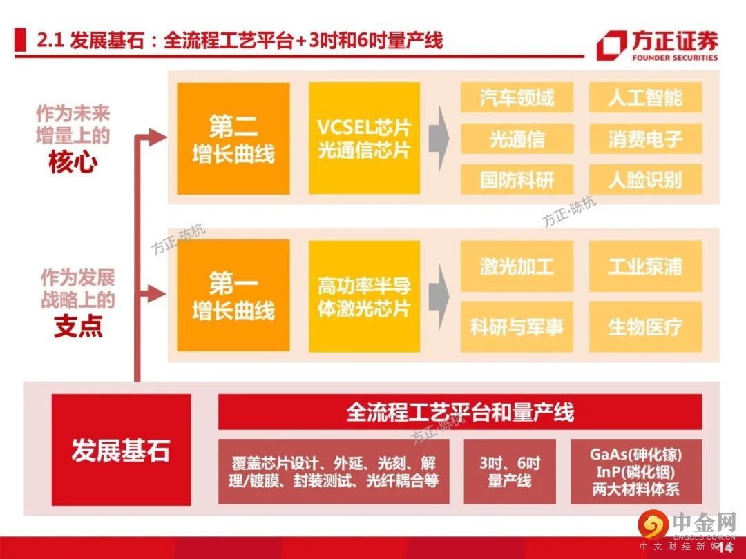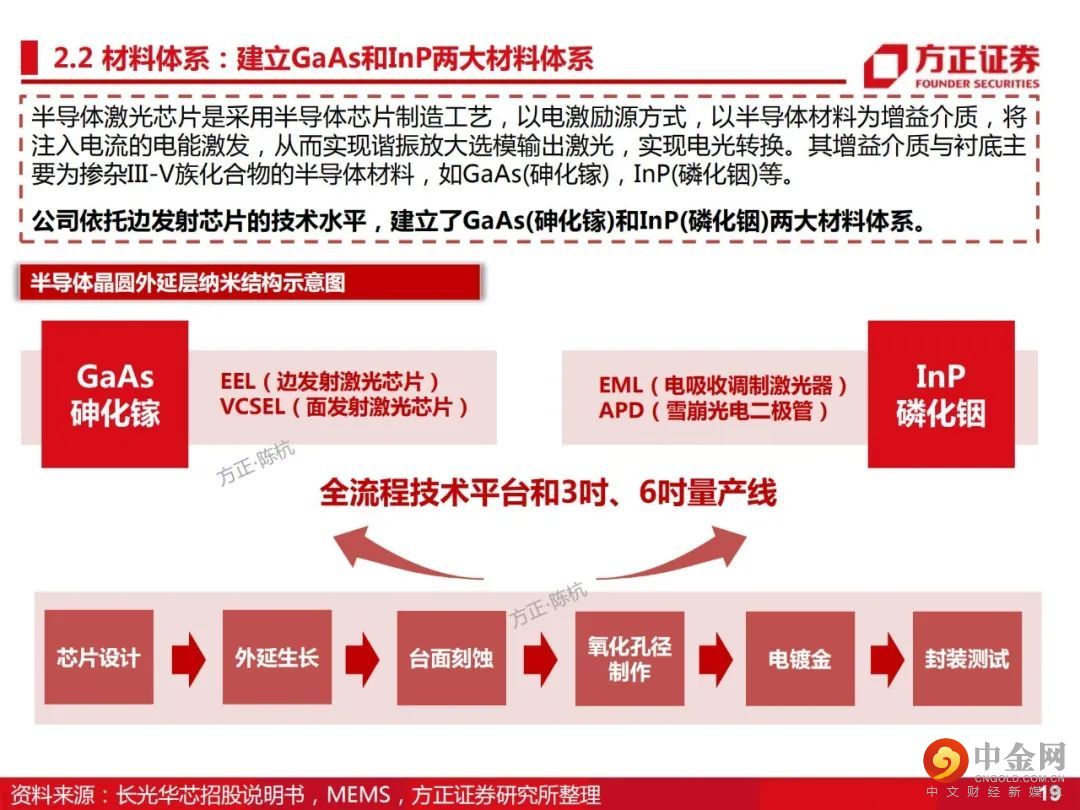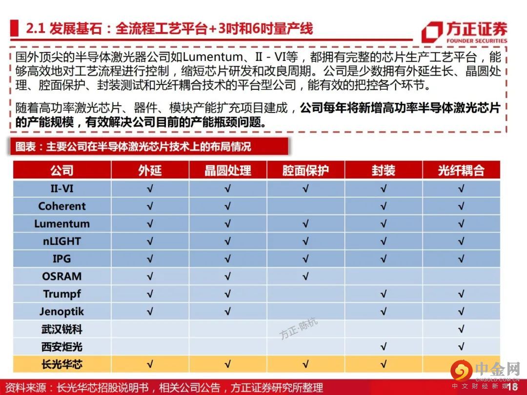 2、纵向延伸,横向扩张,建立行业龙头地位。横向扩展,成功构建了GaAs(砷化镓)和InP(磷化铟)两大材料体系,具备EEL和VCSEL两大制造工艺及产品体系,建立了国内全制程6吋VCSEL产线,为公司未来在3D智能传感、光通信、激光雷达市场的开拓打下坚实基础。结合公司高功率半导体激光芯片的优势,纵向延伸至激光器件、模块及直接半导体激光器。