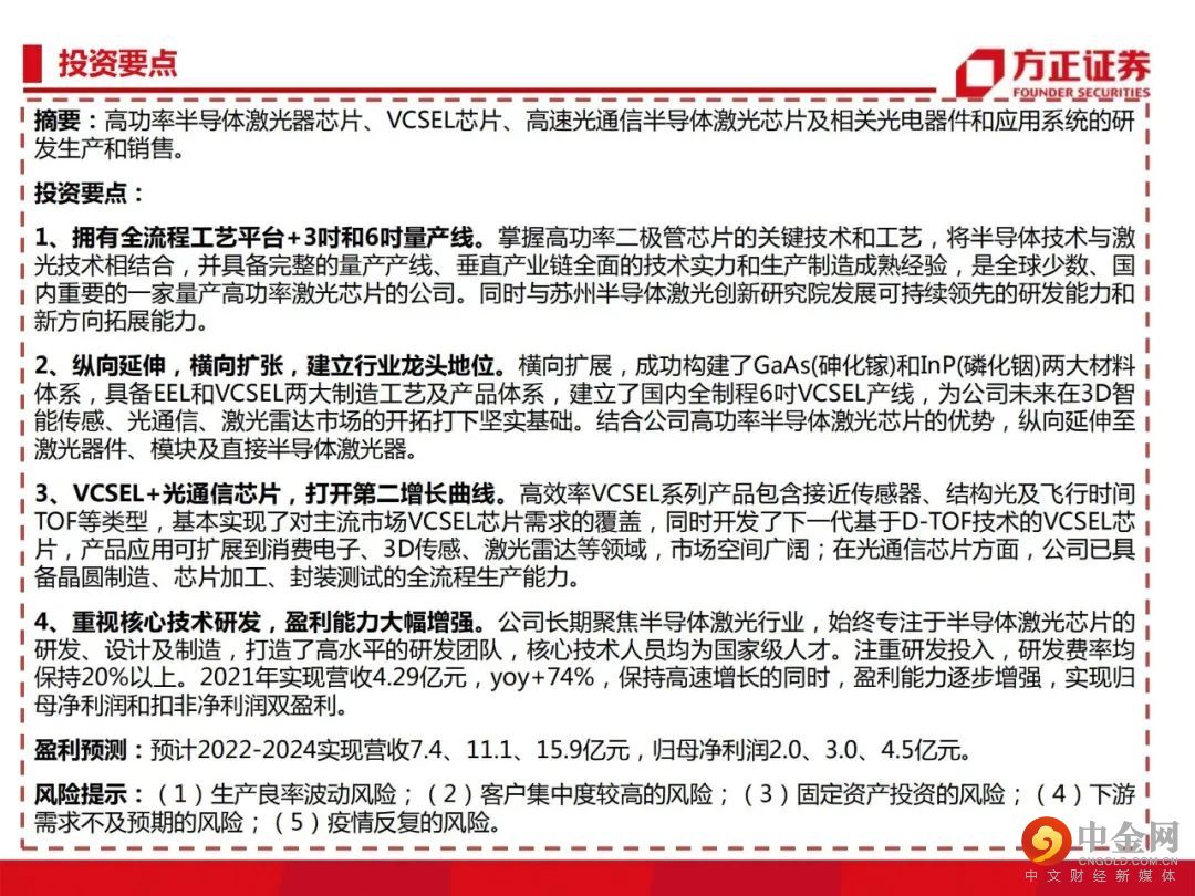 4、重视核心技术研发,盈利能力大幅增强。公司长期聚焦半导体激光行业,始终专注于半导体激光芯片的研发、设计及制造,打造了高水平的研发团队,核心技术人员均为国家级人才。注重研发投入,研发费率均保持20%以上。2021年实现营收4.29亿元,yoy+74%,保持高速增长的同时,盈利能力逐步增强,实现归母净利润和扣非净利润双盈利。盈利预测:预计2022-2024实现营收7.4、11.1、15.9亿元,归母净利润2.0、3.0、4.5亿元。风险提示:生产良率波动风险;客户集中度较高的风险;固定资产投资的风险;下游需求不及预期的风险; 疫情反复的风险。