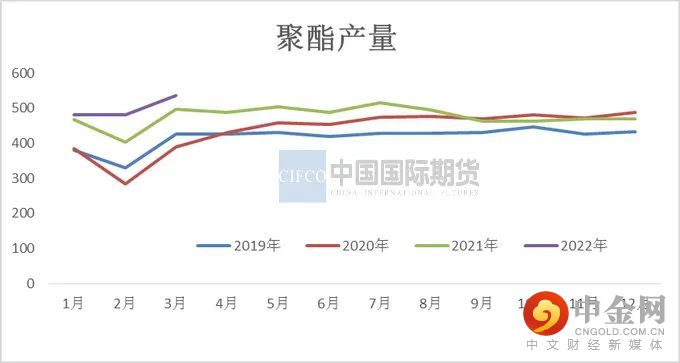 3月聚酯开工负荷从高点94%回落至月底91.8%,由于中下旬疫情影响需求,消费市场显著降温,聚酯各行业普遍面临需求偏弱的问题,3月月均负荷93.58%,此负荷高于往年平均水平。3月底聚酯大厂宣布4月份减产计划,预计聚酯工厂逐步加大减产力度,首先维持10-15%的减产水平。