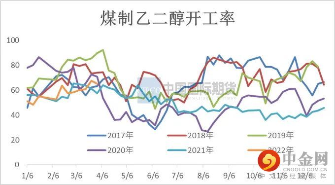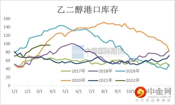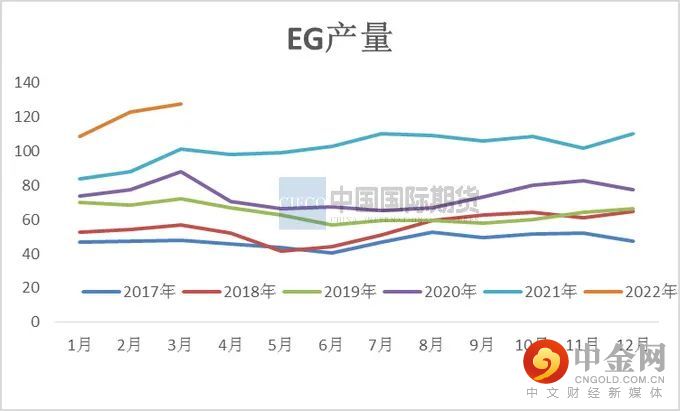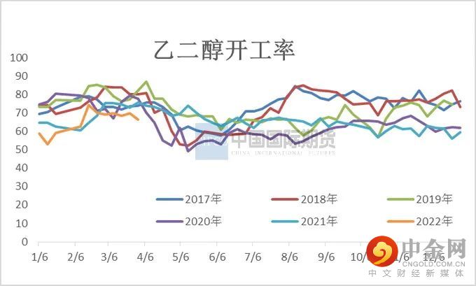 近五年来国内乙二醇产能保持较高增长速度,特别在2021年国内乙二醇产能增速为29.43%,截至3月乙二醇总产能基数2189.5万吨,煤制乙二醇总产能795万吨。3月煤制乙二醇开工率为63.97%,较上月提升3.23%。3月内煤制负荷提升主要是新杭40万吨重启、天业60万吨及建元26万吨负荷提升。河南煤业(濮阳)20万吨3月中旬起停车,重启或将推迟。内蒙古兖矿40万吨检修计划推迟至4月上旬,停车时长在40天附近。