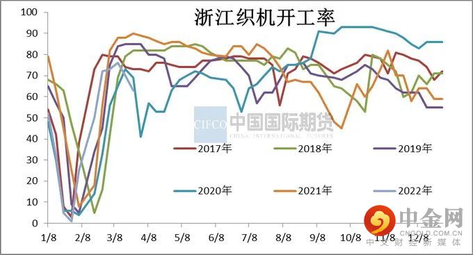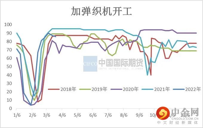 3月下旬开始下游订单和开机出现逆季节回落,且明显差于往年,坯布价格逐步下跌,常规产品即时利润普遍处于亏损状态,与此同时疫情导致物流不畅,坯布发货缓慢,库存继续走高,局部经编企业库存处于爆仓状态,且高库存占据资金比重大,存在相当一部分织造企业有意向在月底月初或者清明节进行阶段性停产放假,以缓解自身的库存压力。江浙织造开机从3月上旬的最高76%下降至月底60%,下降16%,月底临近清明节,持续升温的交通管制政策对终端加弹、织造工厂的物流收发影响进一步加剧。织造工厂近期维持高产品库存运行中,对清明放假的意向依旧较浓,放假时间在2-10天不等,初步估计清明节期间江浙织造负荷降至5成以下。