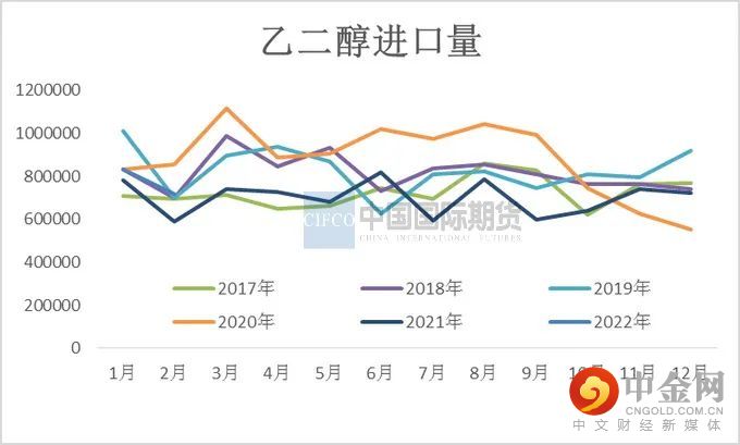 2022年1月我国乙二醇当月进口量为831314.67吨,当月进口金额为56032.18万美元,当月进口均价为674.02美元/吨,进口量环比上涨15.31%,进口量同比上涨6.57%。2月我国乙二醇当月进口量为719062.94吨,累计进口量为1550377.61吨,当月进口金额为48643.41万美元,累计进口金额为104675.59万美元,当月进口均价为676.48美元/吨,累计进口均价675.16美元/吨,进口量环比下跌13.50%,进口量同比上涨21.87%,累计进口量比去年同期上涨13.15%。