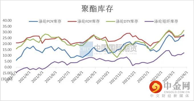 聚酯负荷2-3月份开工高位,对于聚酯工厂本身而言,面临价格和库存的双重风险。聚酯高库存去化需要很长的时间,江浙涤丝POY、FDY、DTY平均库存分别在24天、27天、28天左右,处于较高水平,工厂库存压力较大。减产有利于降低库存压力,适当改变一下行业的库存结构。