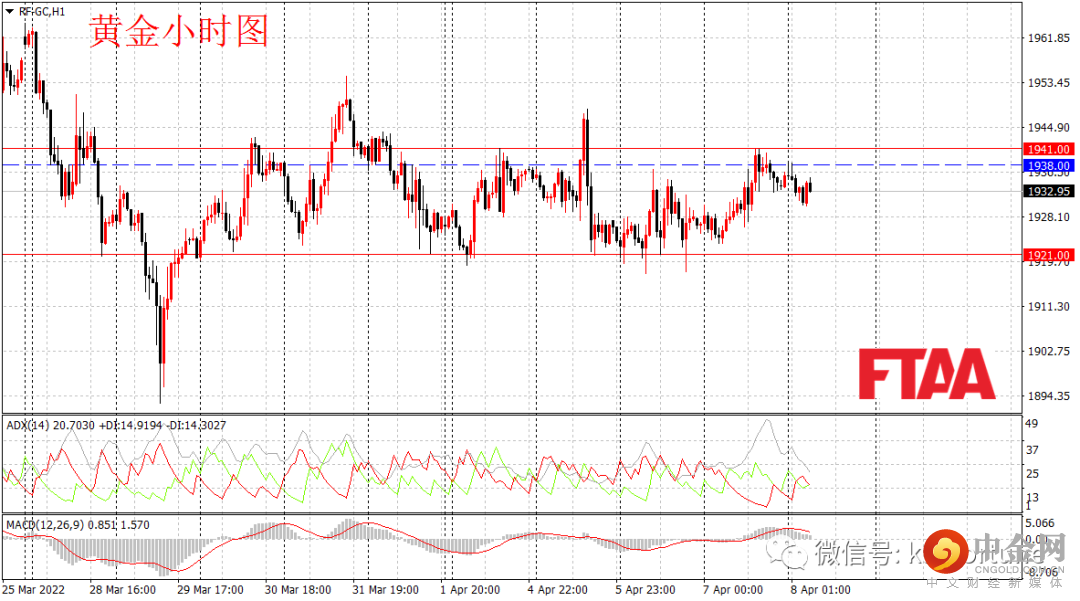 黄金期货周四上涨,最低1923.05,最高1941,日图收出小阳线,现实短期多头占优,但当前MACD指标贴近0轴运行,ADX指标低位,金价日图级别整体或维持震荡。小时图看,昨日亚盘开盘调整后,欧美盘时段震荡回升,美盘后段美股反弹,避险情绪回落,金价调整。日内或延续震荡。今早亚盘金价小幅调整,操作上可现价附近,或逢高在1938附近轻仓空,止损1941,目标1921。