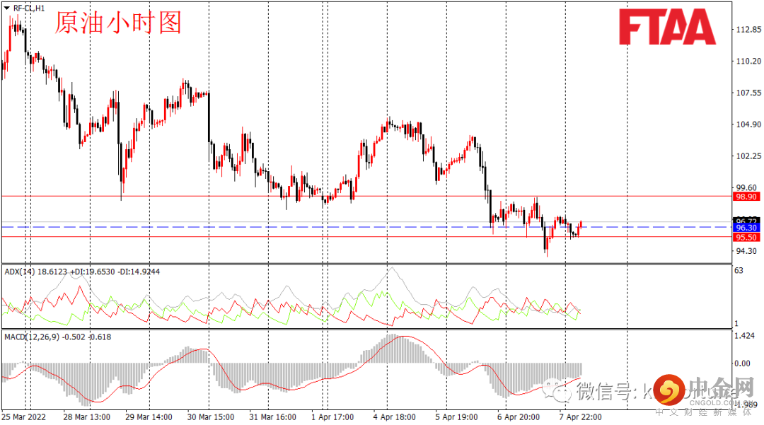 原油周四进入震荡,最高98.78,最低93.81,日图收出十字星,显示短期多空平衡。但日图级别整体维持偏空。昨日油价亚欧盘维持震荡,美盘时段美国宣布禁止俄罗斯能源进口的消息,叠加美股下行打压原油,油价一度创出短线新低。当前MACD指标有背离迹象,今早亚盘油价下探后当前反弹,操作上可观望,或逢低在96.30附近轻仓多,止损95.50,目标98.90。