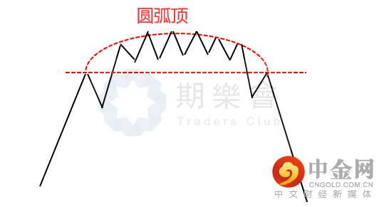 圆弧顶是指价格或指数呈现出圆顶走势,当价格到达高点之后,涨势趋缓,随后逐渐下滑,是见顶图形,预示后市即将下跌。整个形态完成耗时较长,常与其它形态复合出现,市场在经过初期多方力量略强于空方力量的进二退一式的波段涨升后,多方力量减弱,而空方力量却不断加强,中期时,多空双方力量均衡,此时价格波幅很小,后期空方力量超过多方,价格回落,当向下突破颈线时,将出现快速下跌。