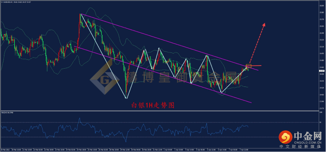 从下方的白银1H周期图来看,近期白银价格维持在下降通道内运行,早间价格再度测试24.65的通道上轨压力,若上破失败,再度向下测试24.10的前低附近支撑的概率增大,但若成功上破通道下轨的压制,则白银价格有望打开新的上升空间,上方关注25.80的前高压力,考虑到布林带三轨拐头向上,表明行情偏多的概率增大,日内可以等待突破行情。从RSI指标来看,RSI处于上升趋势,且维持在50.0上方运行,表明多头动能增强,后市再度上攻的概率增大,因此日内可以等待突破追多的机会。