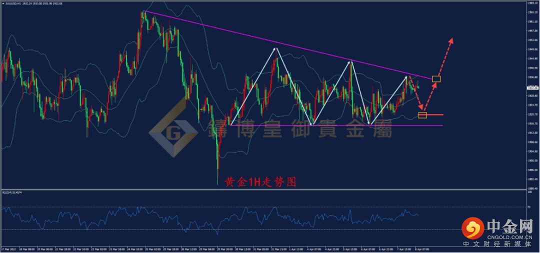 从下方的黄金1H周期图来看,黄金价格维持在收敛三角形态内运行,下方1915的支撑强劲,上方1938的三角形上轨压力较大,在上破三角形区间之前,金价维持震荡的概率大,考虑到4月6日以来,金价低点逐步抬高,且布林三轨拐头向上支撑金价,表明行情偏多的概率增大,1923的布林下轨支撑可作为较好的多单入场点。从RSI指标来看,RSI处于上升趋势,且维持在50.0上方运行,表明多头动能增强,后市再度上攻的概率增大,因此日内可以等待低多的机会。