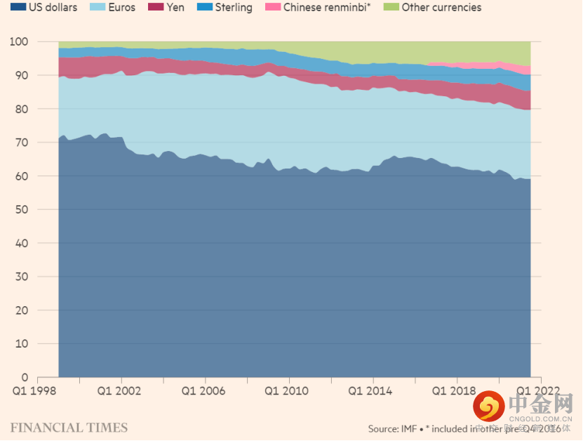 据国际货币基金组织的最新数据,2021年底,在全球央行持有的价值12万亿美元的外汇储备中,美元所占比例约为59%。这一比例低于1999年欧元推出时的71%。