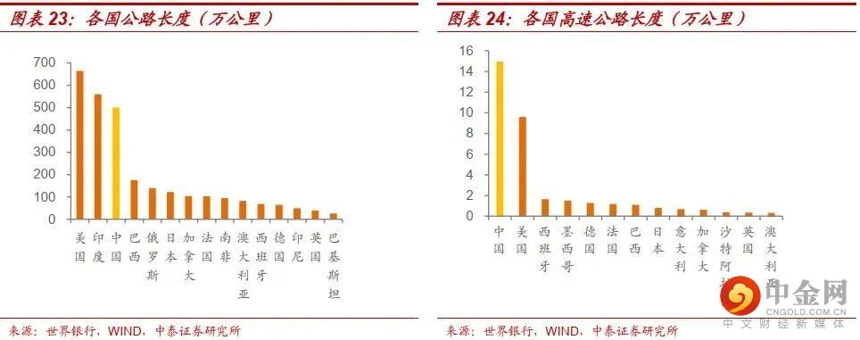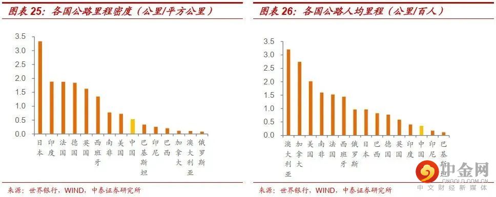 截至2020年,我国公路总里程排名世界第三,共计501.25万公里,仅次于美国和印度;同时高速公路总里程排名世界第一。不过,我国公路总里程密度和人均里程仅高于个别样本国家,与大多数发达国家差距较大。