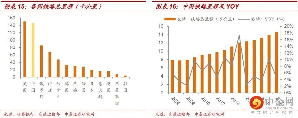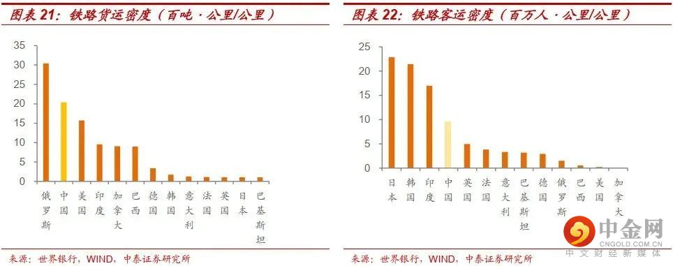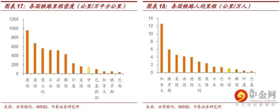 我国铁路密度和人均铁路里程跟主要发达国家差距较大。从铁路里程密度来看,在世界主要国家中,中国(150.03公里/万平方公里)仅高于巴基斯坦(101.06)、加拿大(53.2)、俄罗斯(52.3)、巴西(35.7),较德国、英国等发达国家有较大差距,甚至低于印度(230.2);从铁路人均里程来看,中国(1公里/万人)仅高于韩国(0.81公里/万人)、巴基斯坦(0.35公里/万人),低于印度(0.5公里/万人),与发达国家有较大差距。