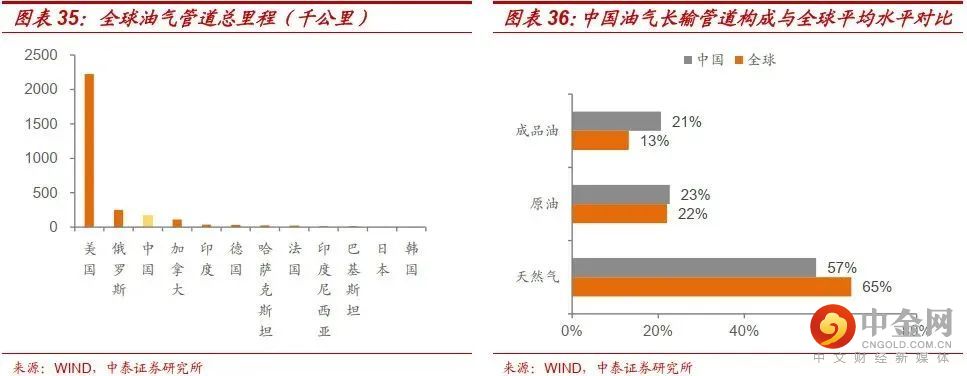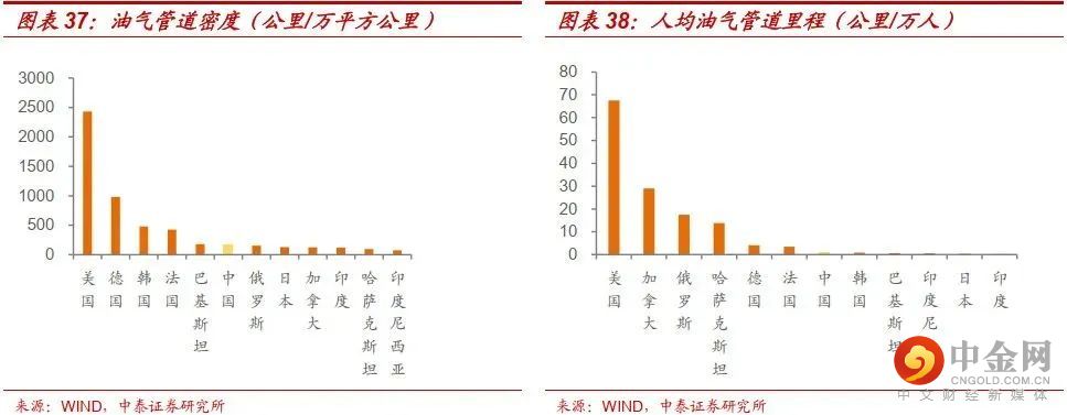 从密度和人均水平看,2021年中国管道密度为175公里/万平方公里,与巴基斯坦(178公里/万平方公里)、俄罗斯(154公里/万平方公里)相当,但远低于美国(2432公里/万平方公里)、德国(983公里/万平方公里)等主要发达国家;中国人均管道长度为1.17公里/万人,同样明显低于北美和欧洲主要发达国家。