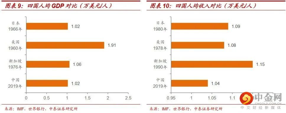从人均GDP(不变价)看,2019年中国人均GDP为1.02万美元,相当于日本1966年的水平(1.02万美元),低于美国1960年水平(1.91万美元)、新加坡1976年水平(1.06万美元)。