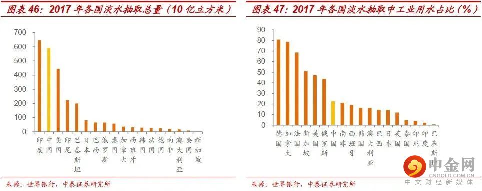 在淡水抽取总量上来看,中国2017年抽取5918亿立方米淡水,排名世界第二;2017年中国工业用水抽取淡水占总抽取量的22.3%,与俄罗斯、西班牙接近,远低于德国(80%)和加拿大(78%)。