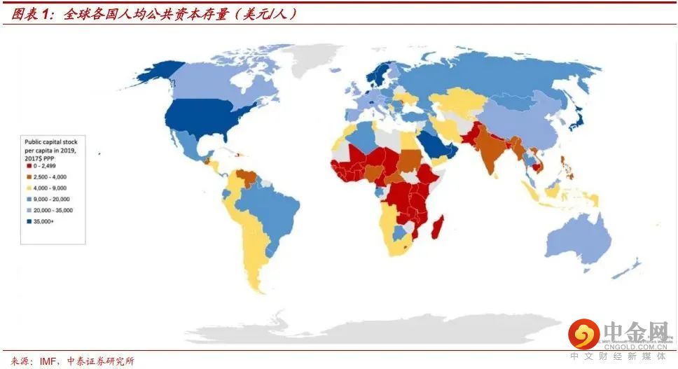 为了便于国际比较,我们统一参考IMF官方公布的基建投资统计口径(数据更新至2019年),以公共投资指标反映各国每年新增的基础设施投资,以公共资本存量指标作为各国基础设施资本存量。