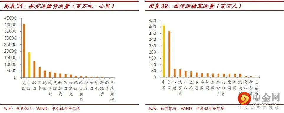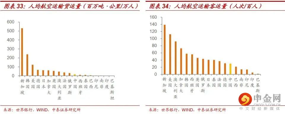 与世界其他主要国家对比,2020年我国航空运输货运量为19264百万吨·公里,排名世界第二,但仅为美国的二分之一;2020年我国航空运输客运量达417百万人,排名世界第一。从人均来看,中国人均航空货物运输量为14吨·公里/人,而排名第一的新加坡高达531吨·公里/人,我国与发达国家差距较大;人均航空客运量为每百人30人次,与德国数据相当,但远低于新加坡、美国、澳大利亚等发达国家。