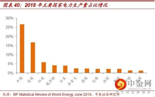 根据《BP Statistical Review of World Energy June 2019》,中国是世界上电力生产最多而且增幅最大的国家,2018年发电量高达7111.8TWh,占世界总量的26.7%;相比之下,美国2018年发电量为4460.8TWh,同比增长3.7%,占全球总量的16.8%。