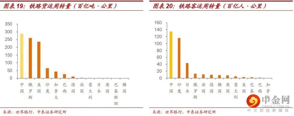我国铁路货运周转量和客运周转量均居世界第一。货运周转量为实际运送的货物吨量与其运输距离的乘积,2018年中国铁路货运周转量达288.21百亿吨·公里,较俄罗斯、美国分别高出11%和22%,远超世界其他主要国家;客运周转量为实际运送的旅客人数与其运输距离的乘积,2017年中国铁路客运周转量达134.57百亿人·公里,较第二名印度高出16%,是第三名日本的3倍多。