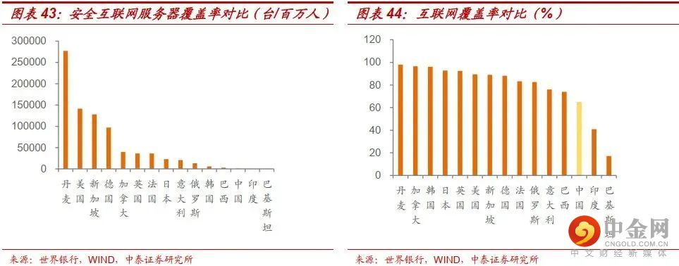 通信:仍有较大提升空间。2020年中国每百万人仅拥有948台安全互联网服务器,在样本国家中仅高于印度和巴基斯坦,相当于第一名丹麦的0.3%;中国每百人仅有65人使用互联网,而丹麦、加拿大和韩国等国个人互联网使用率高达95%以上。不过,我国移动端通信条件较好,移动蜂窝网络覆盖率高于世界均值10个百分点。