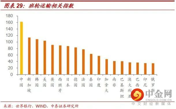 1)交通运输方面,我国铁路和公路总里程位列世界前茅,但密度和人均水平与发达国家存在一定差距;航空运输的货运量和客运量排在世界前二,但人均水平与发达国家差距较大;港口海运的码头吞吐量和班轮运输相关指数均排名世界第一,人均水平也与发达国家基本一致。