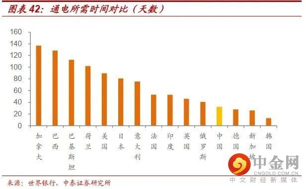 我们比较通电所需时间来判断电力基础设施运营部门提供相关服务的效率。2019年,在中国通电所需时间为32天,大幅低于世界平均水平(82天),同时低于中高等收入国家平均水平(78天)。而美国、德国、日本的通电所需时间分别是89.6天、28天、80.9天,我国在电力基础设施服务效率方面表现较好。