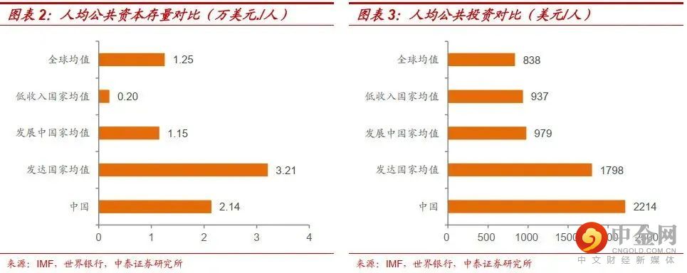 我国基建存量和新增投资“双第一”。2019年,我国公共资本存量(不变价)高达30.19万亿美元,位列世界第一,当年公共投资规模(不变价)为31240亿美元,同样位列世界第一。即使考虑到我国人口基数庞大,从人均角度看,基建水平同样排名靠前。2019年人均公共资本存量和人均公共投资分别排名全球第37位和第13位。