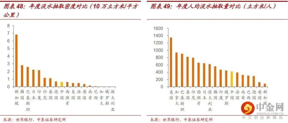 从密度上看,2017年我国淡水抽取密度为6.3万立方米/平方公里,与德国、西班牙接近;我国2017年人均淡水抽取量为419立方米/人,远低于北美,与韩国、俄罗斯、法国等国接近。