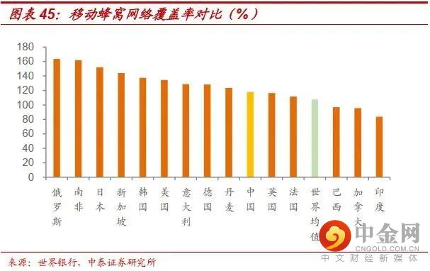 我国移动端通信条件处于较高水平。移动蜂窝网络覆盖率高于世界均值10%。2020年中国移动蜂窝网络覆盖率为118%,高于英国(116%)、世界均值(107%)、巴西(97%)等。