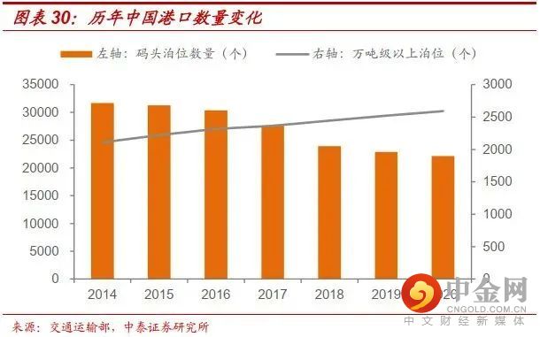 2014年以来,我国沿海建设投资额呈下降趋势,新增各类泊位数量逐年下降。不过,随着各类港口整合的持续深入,我国万吨级以上港口泊位数量持续增长。截至2020年底,全国港口拥有生产用码头泊位22142个,比上年末减少751个。其中,万吨级及以上泊位2592个,比上年末增加72个,万吨级及以上泊位占比由2014年的6.7%提升至2020年的11.7%。