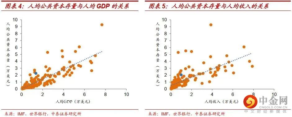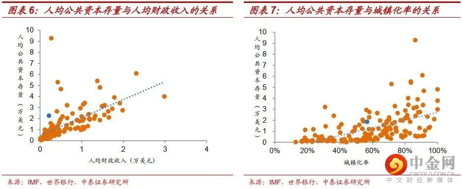 相较于其他经济社会发展指标,我国基建发展明显超前。我们通过对比人均GDP、人均收入、人均财政收入、城镇化率等四个指标,来衡量我国当前人均公共资本存量规模是否合理。理论上讲,这四个指标越高的国家,对应的人均公共资本存量也应该越高。从样本数据拟合结果看,人均公共资本存量与人均GDP、人均收入、人均财政收入、城镇化率均呈显著正相关。不过,我国目前人均公共资本存量明显高于拟合值,意味着基建发展水平超前于其他经济社会发展指标。