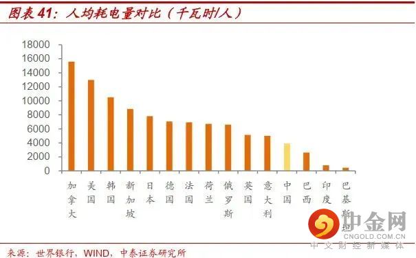 但从人均来看,中国人均耗电量为3905千瓦时,仅为第一名加拿大的四分之一,低于美国、韩国、新加坡等主要发达国家,高于巴西、印度、巴基斯坦等国。