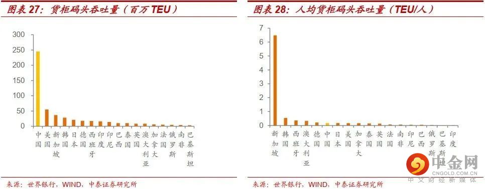 港口集装箱吞吐量衡量的是通过陆运到海运(反之亦然)方式运输的集装箱流量,以20英尺当量单位的标准尺寸集装箱为计算单位。根据世界银行最新数据,2017年中国货柜码头吞吐量(245百万TEU)达世界第一,远超其他国家。从人均水平看,中国和主要发达国家基本一致,2017年人均为0.17 TEU,与德国、日本和美国相近。