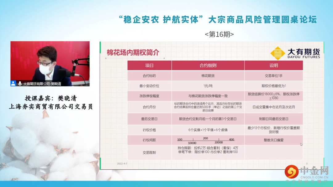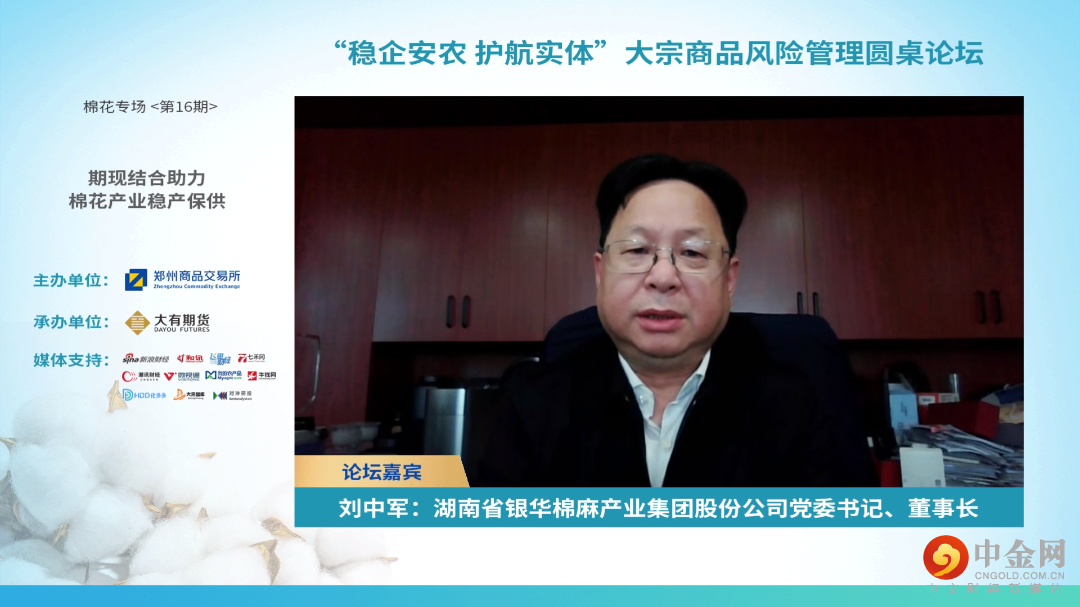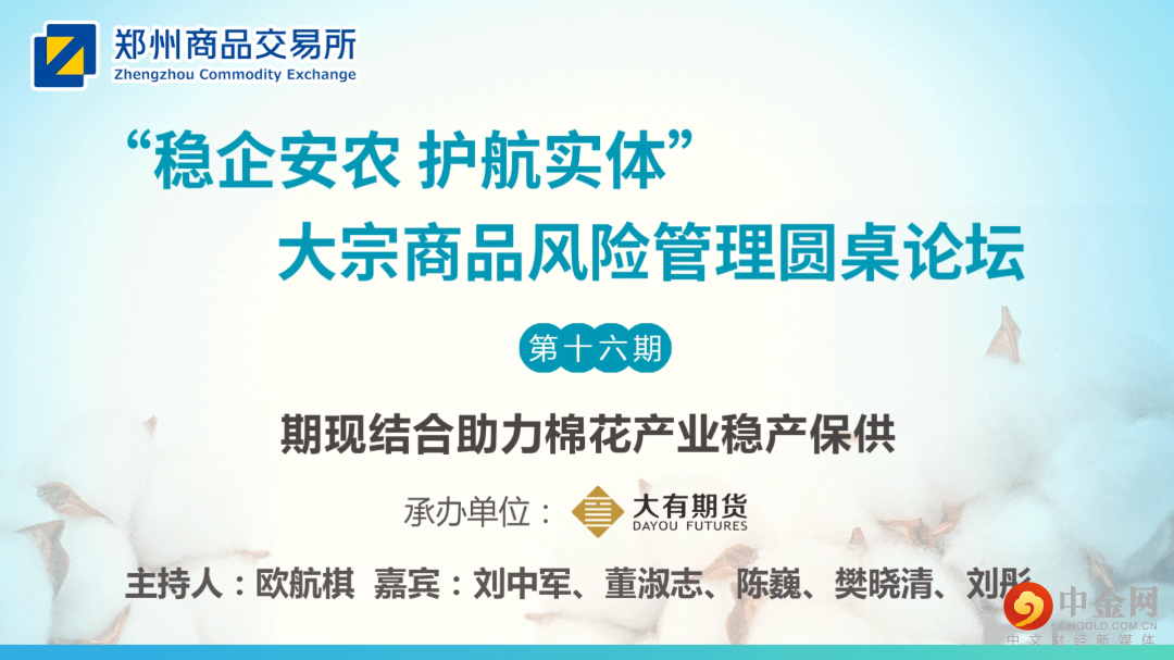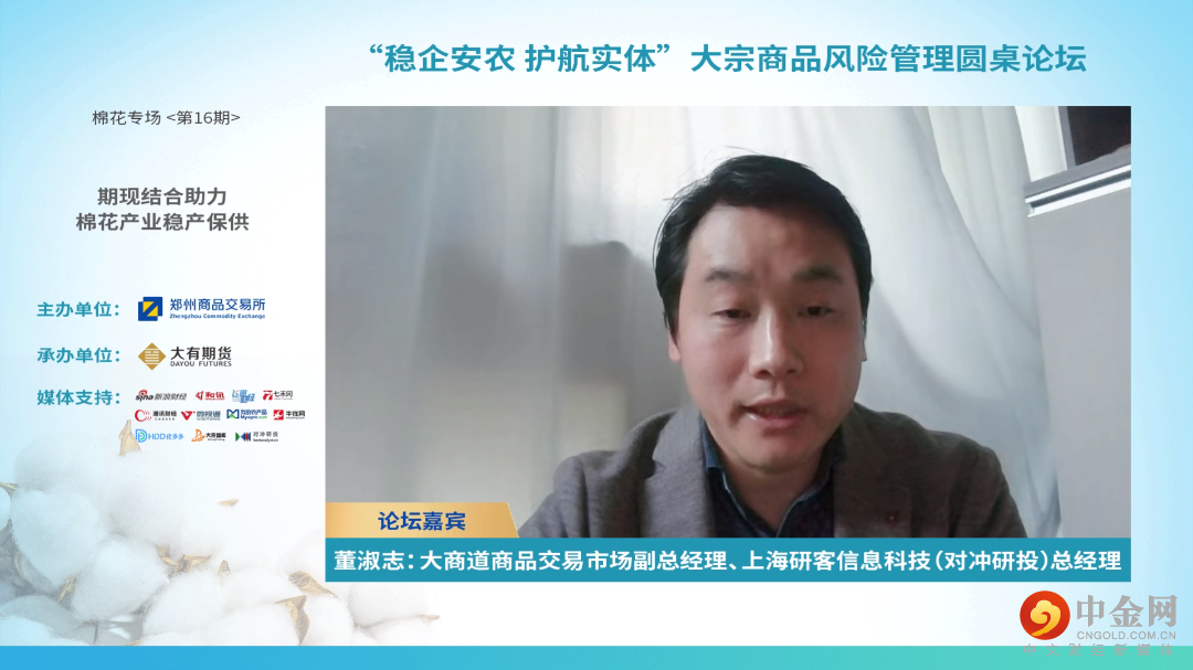 2022年4月7日,由郑州商品交易所主办,湖南省期货业协会、大有期货有限公司承办的第十六期“稳企安农 护航实体”大宗商品风险管理圆桌论坛成功举办。本次的会议主题为期现结合助力棉花产业稳产保供,分为主题分享和圆桌讨论两个环节。邀请的嘉宾有:湖南省银华棉麻产业集团股份公司党委书记、董事长刘中军、大商道商品交易市场股份有限公司副总经理、上海研客信息科技有限公司(对冲投研)总经理董淑志、艾地盟(上海)管理有限公司棉花高级贸易经理陈巍、上海夯石商贸有限公司交易员樊晓清、大有期货投研中心农产品研究员刘彤。