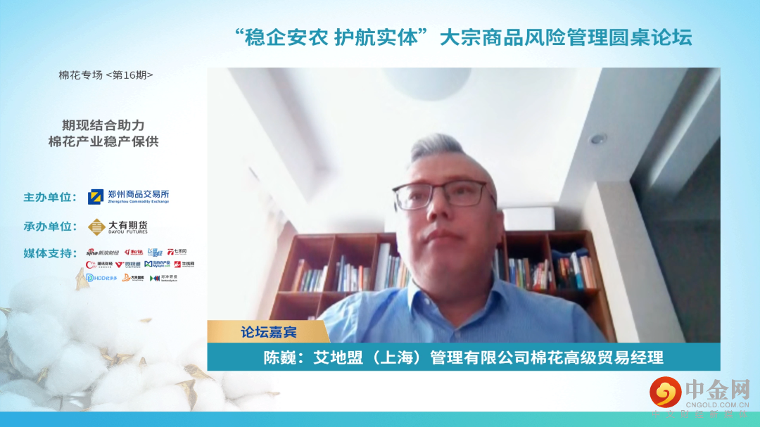 随后,展开了以“期现结合助力棉花产业”为主题的讨论,刘中军、董淑志、陈巍分别从现货、投研和期现结合的角度进行了经验分享。