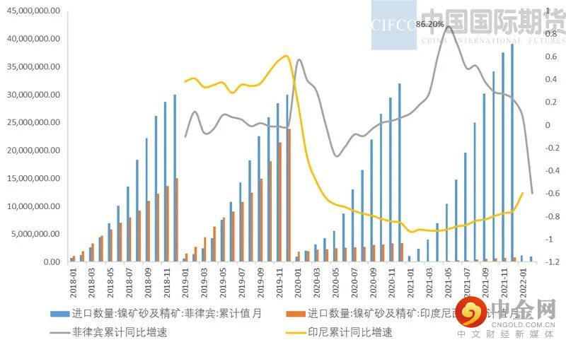 2022年1-2月中国镍铁进口总量71.64万吨,同比增加12.23%。其中,自印尼进口镍铁量62.21万吨,同比增加18.89%。