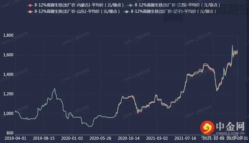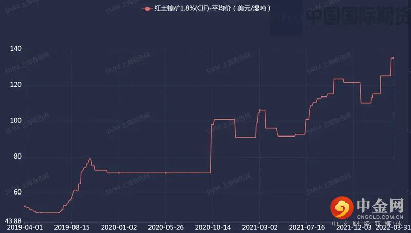 SMM数据显示,2022年3月全国镍生铁产量明显上升,环比增加21.24%至3.95万镍吨;4月镍铁预估产量或环比上升,主要由于下游300系新增产能释放,带来的镍铁的需求增加。