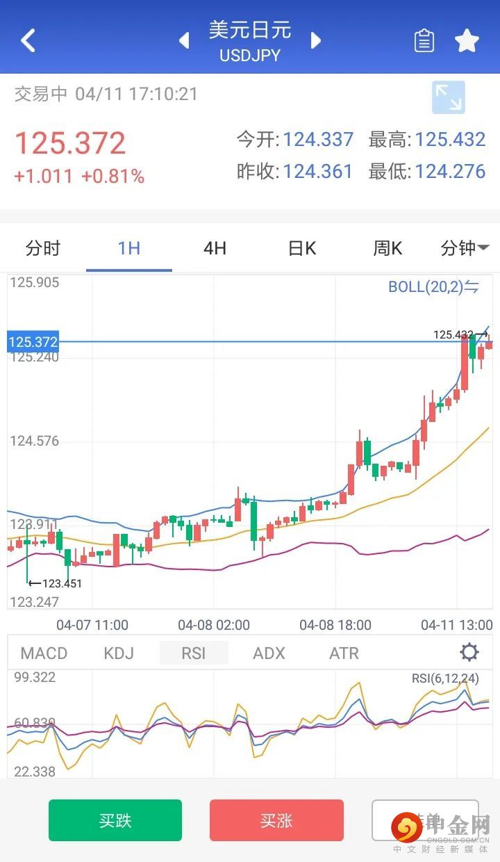 本交易日午后,美元兑日元短线拉升,突破前高125.12,刷新2015年8月以来新高。