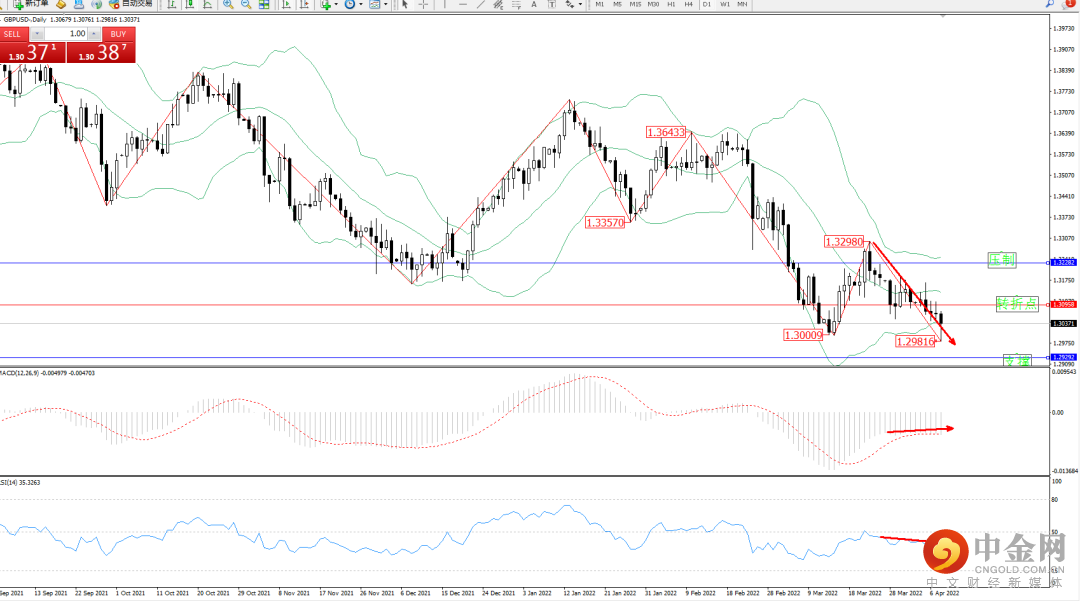 空头动力延续布林带指标通道持续震荡下行,低位抵达1.30009位置后短暂震荡回升,但市场整体下行趋势态势良好,跌破之前低位至1.29816位置后震荡,短期空头动力有继续下行态势,布林带指标呈收口走势持续平移,上方压制关注1.32282附近,低位支撑关注1.29292附近,关注1.30958附近转折点,MACD指标处于空头区域维持整理平移,RSI指标处于空头区域维持整理缓慢下行中,如图: