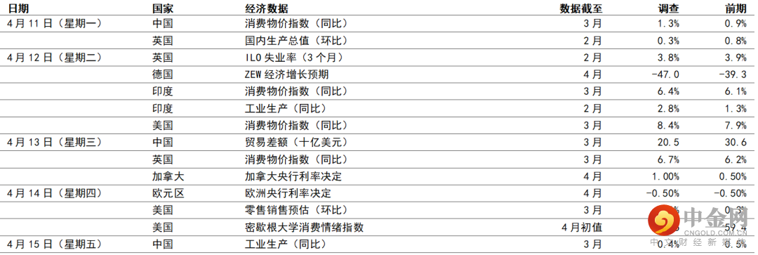 预期美国3月份消费物价指数通胀将继续上升,月内升1.2%,主因为近期油价急升,带动能源价格上涨。核心数据(撇除食品和能源)方面,预期物价将保持在上月0.5%(环比)的水平 — 仍远高于联储局通胀目标所需的0.1%-0.2%(环比)变动。按年计算,整体通胀预期将达到8.4%(核心通胀升同比6.6%)。