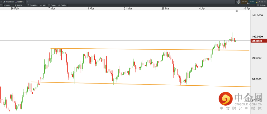 美元指数触及100整数关口,这是自2020年5月以来首次触及该区域,最高涨至100.20,随后回落至100下方,报99.80。