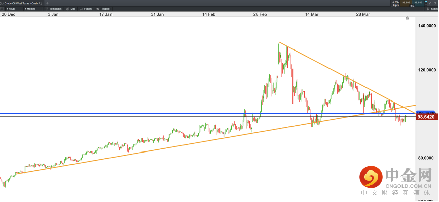 美国原油在上周跌破了100整数关口,并且跌破了自去年12月以来形成了上升趋势线,而上方的下行抛压阻力线也形成,从目前来看,短期仍有回落的可能。上方阻力:100,104。