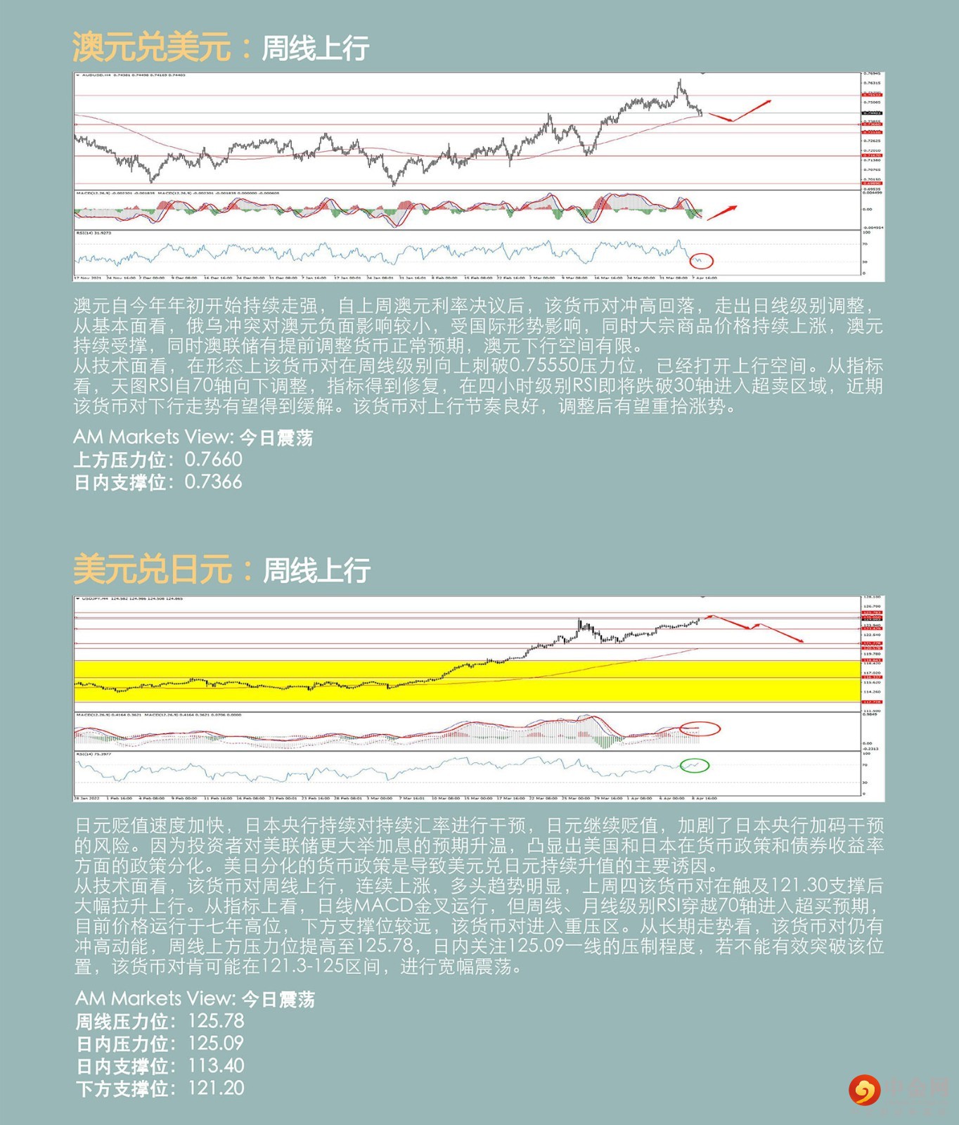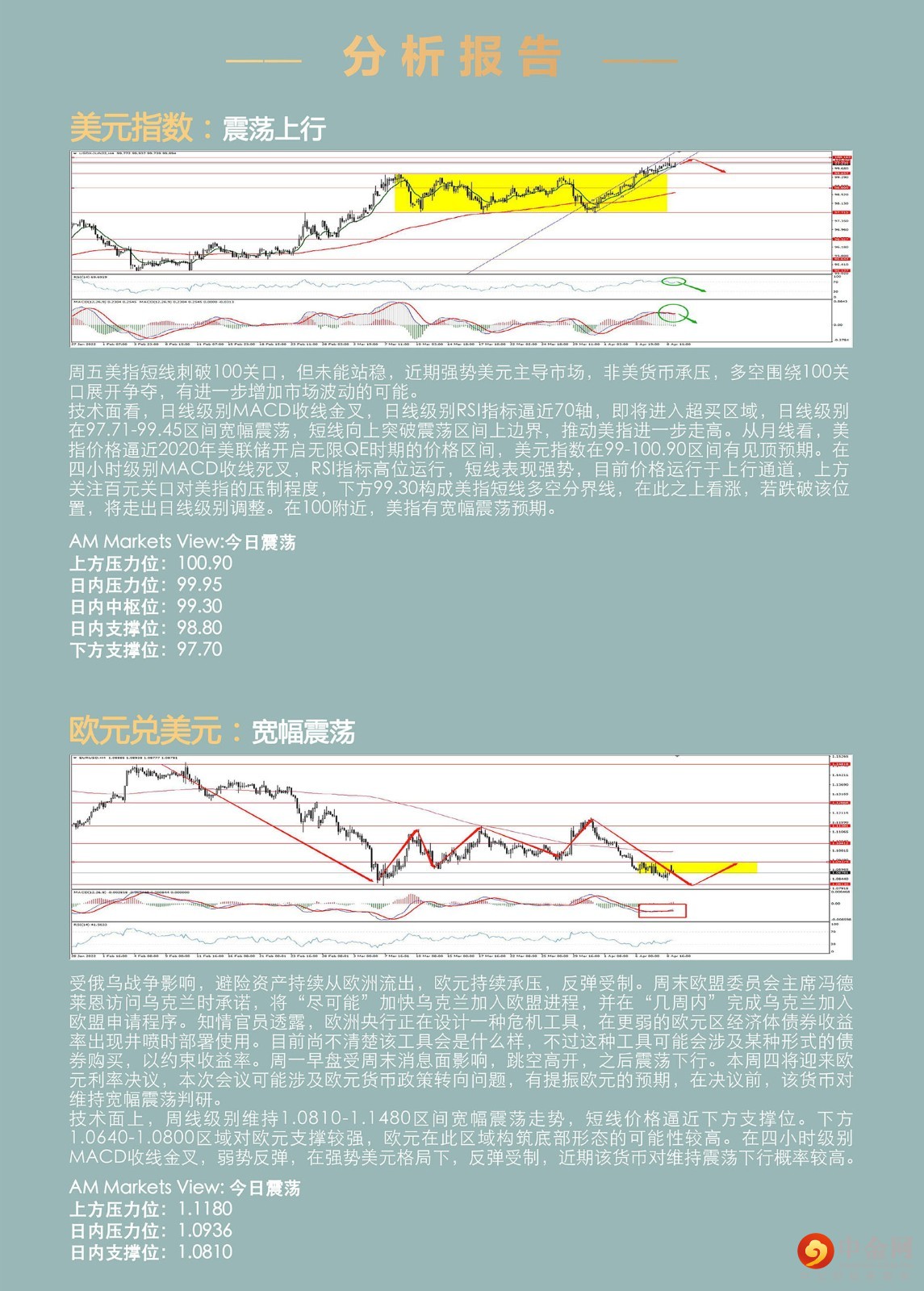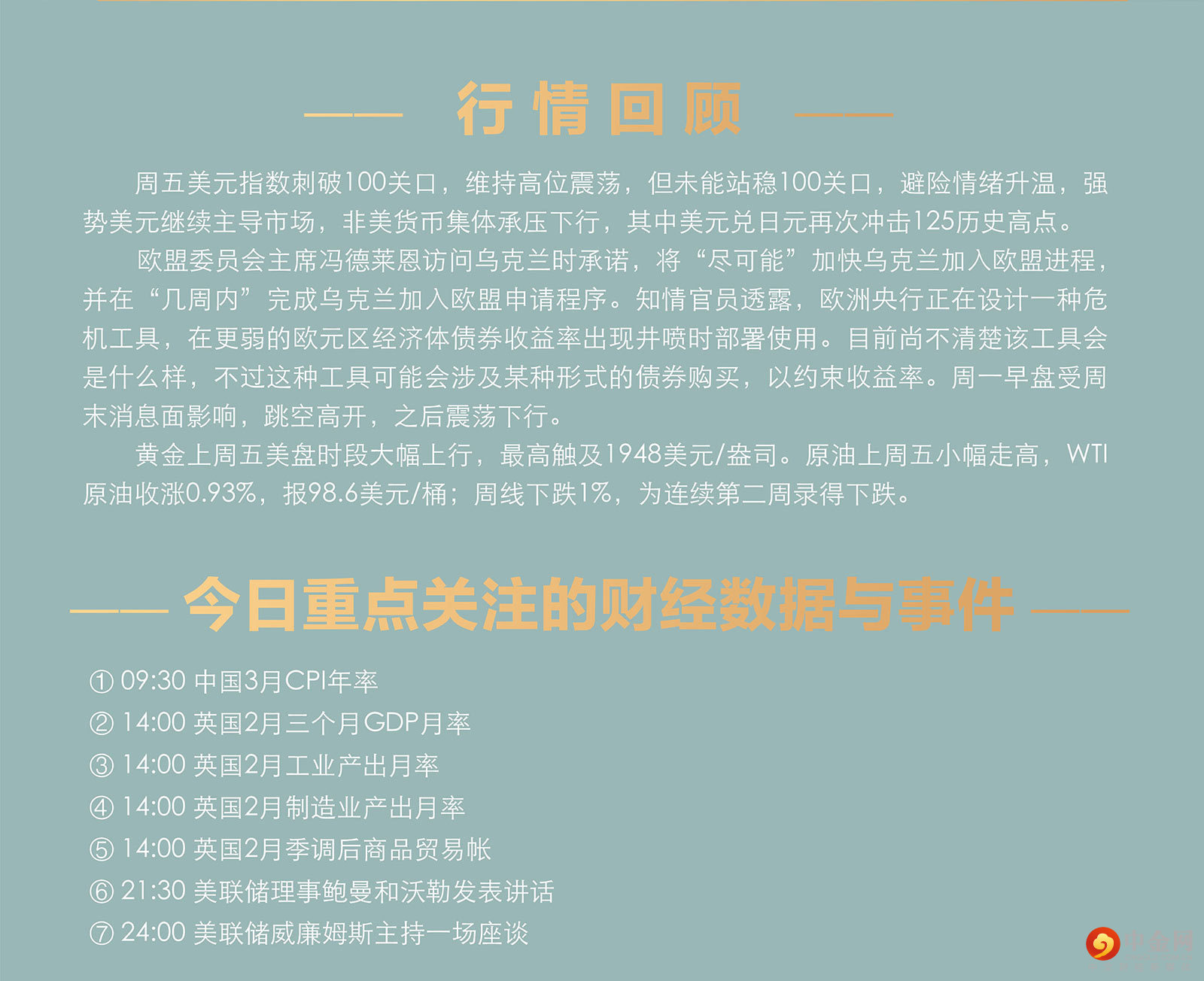 周五美元指数刺破100关口,维持高位震荡,但未能站稳100关口,避险情绪升温,强势美元继续主导市场,非美货币集体承压下行,其中美元兑日元再次冲击125历史高点。 欧盟委员会主席冯德莱恩访问乌克兰时承诺,将“尽可能”加快乌克兰加入欧盟进程,并在“几周内”完成乌克兰加入欧盟申请程序。知情官员透露,欧洲央行正在设计一种危机工具,在更弱的欧元区经济体债券收益率出现井喷时部署使用。目前尚不清楚该工具会是什么样,不过这种工具可能会涉及某种形式的债券购买,以约束收益率。周一早盘受周末消息面影响,跳空高开,之后震荡下行。 黄金上周五美盘时段大幅上行,最高触及1948美元/盎司。原油上周五小幅走高,WTI原油收涨0.93%,报98.6美元/桶;周线下跌1%,为连续第二周录得下跌。