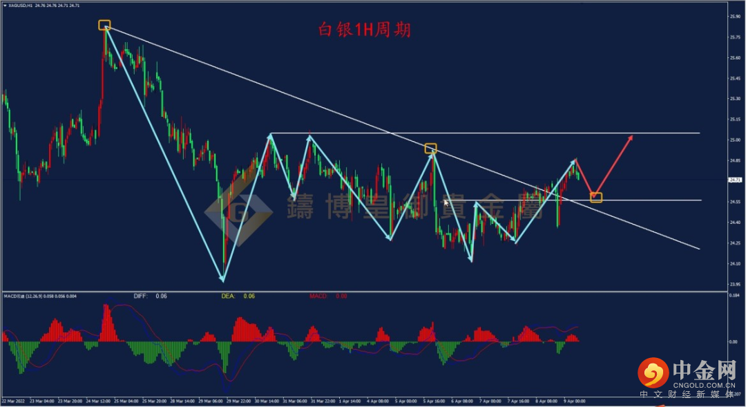 白银上周五小幅上涨,突破自25.80附近下降趋势线压力。从1H周期走势机构看,白银自25.05附近下跌,但并未跌破低点,随后震荡上行,并突破趋势线压力,走势上可看做转为多头,后市较大概率延续上涨,操作上可关注多单机会。结合MACD指标来看,DIFF线与DEA线处于零轴上方,表明多头力量偏强,日内可在其回踩短线支撑24.55附近尝试多单。