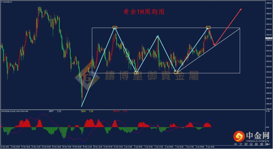 从1H周期走势结构看,黄金自1890.0附近起涨,随后维持区间震荡走势。按照大多数规律,震荡走势通常顺应前一波走势方向突破,黄金1H周期此前为上涨走势,后市较大概率延续上涨,操作上可重点关注多单机会。结合MACD指标来看,DIFF线与DEA线处于零轴上方表明多头力量偏强,日内可在其回踩下方支撑1936.0附近尝试多单,目标上看1965.0附近。