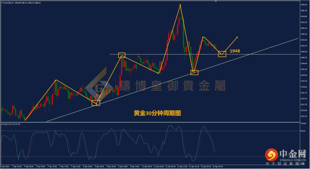 从黄金30分钟周期图来看,黄金整体呈现出高低点同步上行的震荡结构,目前上升趋势依旧保持良好。昨日黄金上攻至1970附近的压力位后,出现快速回落。预计短期将以震荡修复技术指标。短期Stoch技术指标向下发散,预计价格还将回落。短线可以关注本周周线开盘点1948附近的支撑。预计后期回落至此得到支撑并反弹的概率较大。建议投资者尝试在1948附近布局多单。