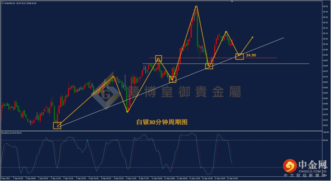 从下方白银30分钟周期图看,白银当前保持着高低点同步震荡上行的技术结构,当前上升趋势依旧保持良好。昨日冲高至25.35附近后再次冲高。短期在次高附近,上攻动能略显不足,下方Stoch技术指标向下发散,预计短期回落概率较大。回调可以关注上升趋势线与水平支撑线的支撑点24.90附近。预计回落至次得到支撑并反弹的概率较大,建议投资者尝试在此位置布局多单。